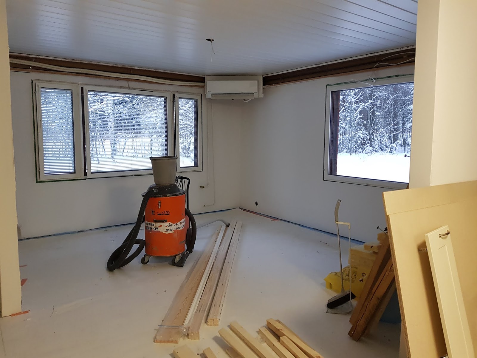 Ompelimon pinnat on maalattu valmiiksi. Siitä tehdään meille uusi tavaransäilytyspaikka, kun saadaan se valmiiksi. Vaikka sokkelikorjaukset on tehty, eikä alapohjasta pitäisi tulla enää mitään hajua, vesieristimme varalta ulkoseinän nurkat, ettei ilmanvaihtoimuri vedä ainakaan sieltä korvausilmaa. Laitamme remontin yhteydessä korvausilmaventtiileitä joka huoneeseen, että ilma vaihtuu riittävästi.